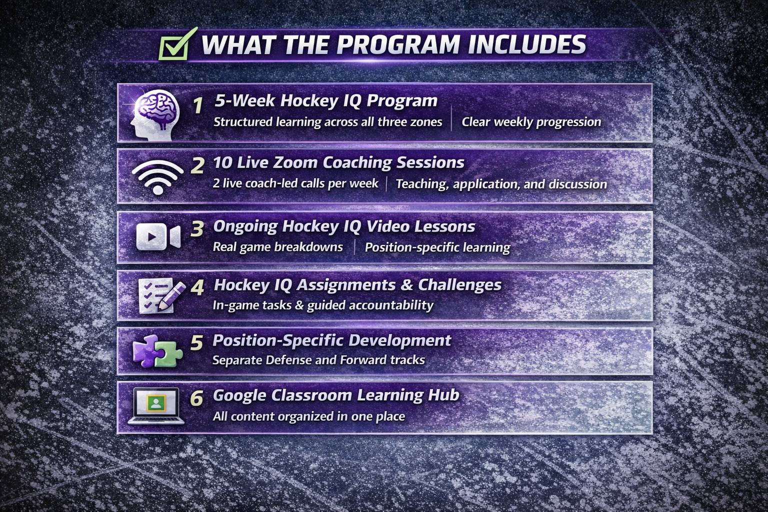 This 5-week Hockey IQ Bootcamp is built for forwards who want to support breakouts, create advantages through the neutral zone, and turn opportunities into goals.